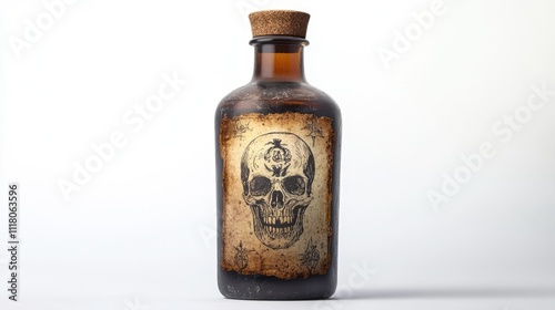 Antique poison bottle featuring an aged label with faded skull illustration, set against white