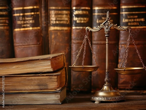Antique scales of justice beside old law books in a dimly lit library setting