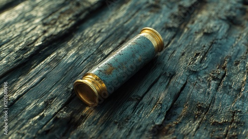 Antique spyglass on weathered wood, sunset backdrop, adventure theme