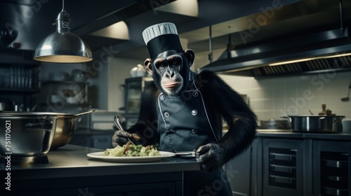 Ape chef cooks preparing food in restaurant kitchen. Monkey chef