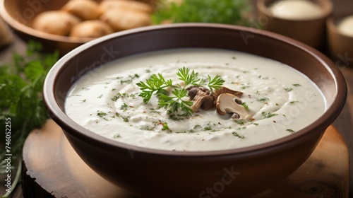 Appetizing mushroom soup on blurred white kitchen background with space for text