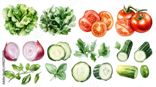 Appetizing Salad bowl and salad elements collection,healthy fresh vegetables,Healthy nutrition, menu or poster,banner for cafe or restaurant concept.