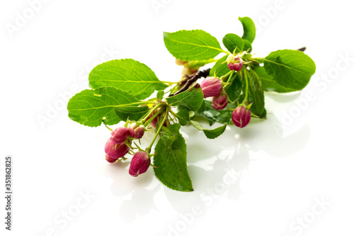 Apple tree branch with unopened flower buds isolated on a white background.