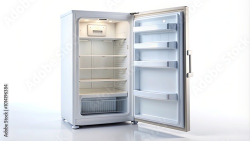 appliance, tourism, cleanliness, travel, hospitality, compact, vacation, A medium shot of a small empty white hotel fridge with the door open isolated on a white background