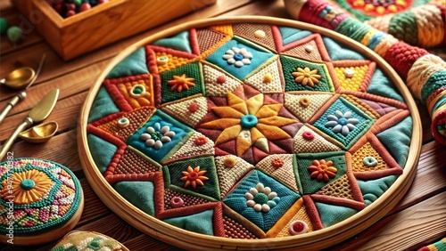 Applique and embroidery in patchwork.Decorative patchwork quilt with floral applique and embroidery. A wonderful kind of needlework to decorate your interior