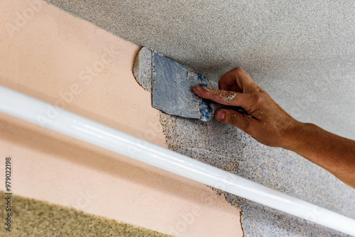 Applying decorative mosaic plaster on the wall.