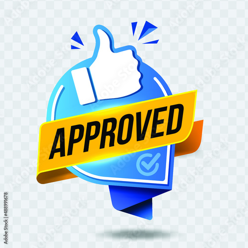 Approved icon. The blue label is accepted with the thumb up. The sign has been tested and verified. Featured product with logo for promotion on transparent background