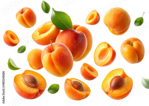 Apricots falling mid-air isolated on a transparent background.