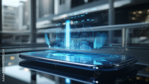 スマートフォンの画面に未来的なARホログラムが浮かび上がる、次世代通信の活用