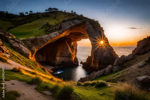 Ar co cave with double hole in rocky formations with green grass landscape against colorful sunset sky with moon generated by AI tool.