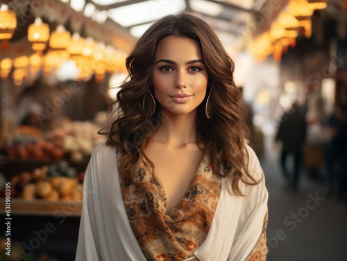 Arab city market, a striking and attractive young woman of Middle Eastern origin confidently strikes a pose, while the bustling crowd of people behind her forms a pleasant, blurred backdrop