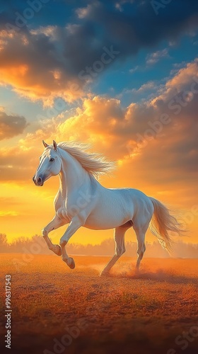 Arabian horse rearing against a vibrant sunset, dramatic sky in the background
