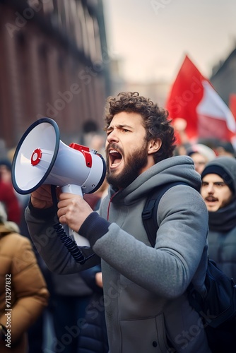 arabian moeslim Male activist protesting on megaphone during a strike with a group of demonstrators in the background