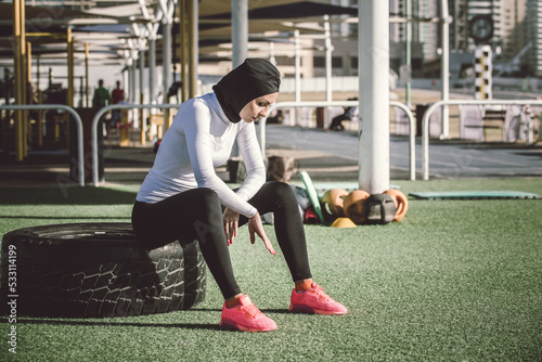 Arabian woman with typical muslim dress training outdoors in Dubai - Middle-eastern beautiful female adult doing fitness outside
