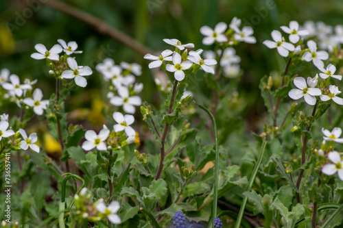 Arabis caucasica arabis mountain rock cress springtime flowering plant, causacian rockcress flowers with white petals in bloom