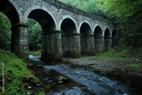 Arched Roman aqueduct over stream in green valley
