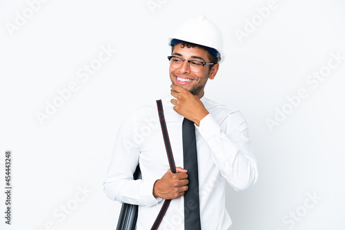 Architect brazilian man with helmet and holding blueprints looking to the side and smiling