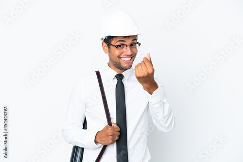 Architect brazilian man with helmet and holding blueprints making money gesture