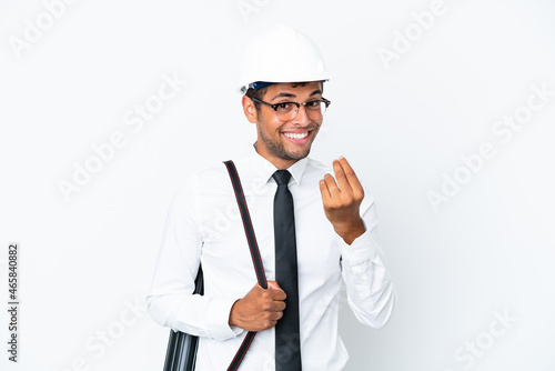 Architect brazilian man with helmet and holding blueprints making money gesture