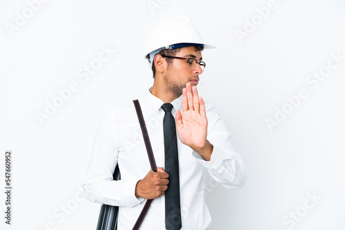 Architect brazilian man with helmet and holding blueprints making stop gesture and disappointed