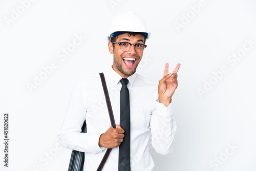 Architect brazilian man with helmet and holding blueprints smiling and showing victory sign