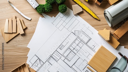 Architect designing house blueprints with wooden samples, ruler and measuring tape on desk