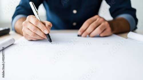 Architect drawing detailed plans on blueprint at desk, close-up of hands