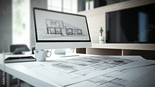 Architect house project concept, desktop computer on white work desk showing CAD sketch, minimalistic living room interior design in background