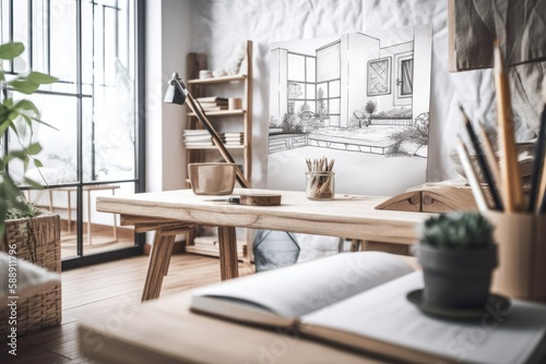 Architect interior designer concept hand drawn draft unfinished project becomes wooden japandi living and room. Farmhouse,. Generative AI