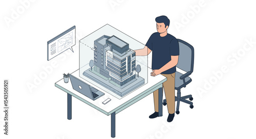 Architectural designer reviewing building model in modern office setting for project development isometric style vector illustration