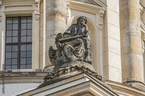 Architectural fragments of French Cathedral (Franzoesischer Dom, 1705) at the Gendarmenmarkt. Berlin, Germany.