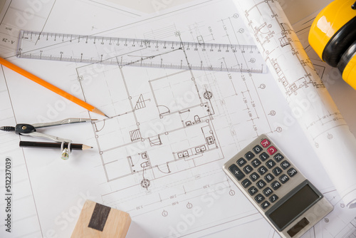 Architectural project workplace. Top view of house plan blueprint paper with repair tools on table desk at architecture office, Engineering architect design tools concept
