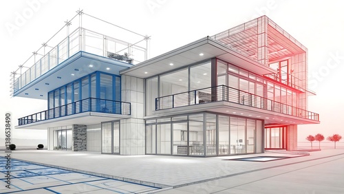 Architectural rendering of a modern building with balconies and large windows in a blueprint style