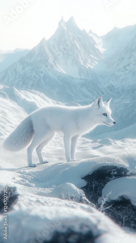 Arctic fox standing on snowy mountain peak.