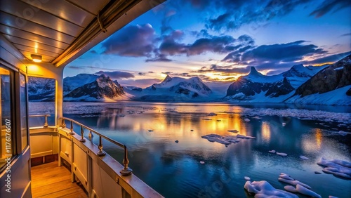 Arctic Ice Fields: Glacial Mountains from a Ship Cabin at Night
