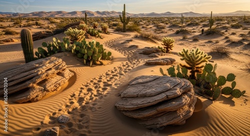Arizona Desert Landscape with Cacti and Sand Dunes at Sunset