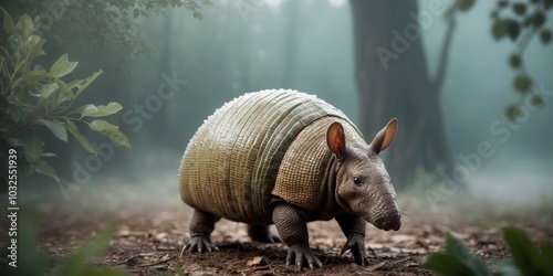 Armadillo in Defensive Posture Amid Woodland Serenity.