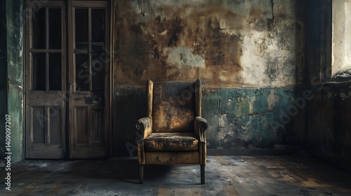 Armchair in Abandoned Room with Peeling Paint and Wooden Door