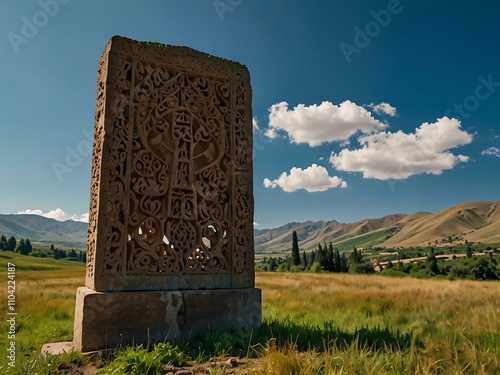 Armenian khachkar standing tall amidst green landscape under clear blue skies.