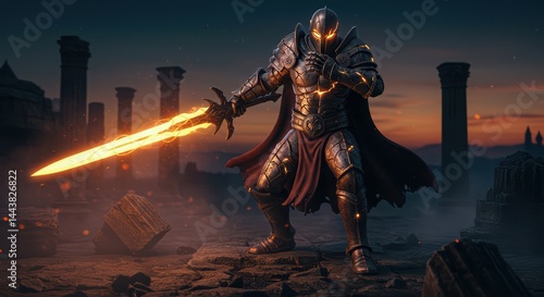 Armored Warrior Holds Flaming Sword in Ruined Landscape