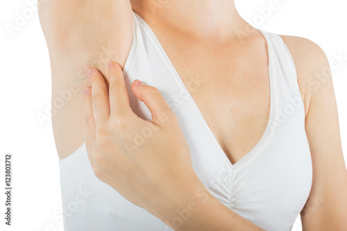 Armpit girl in white lingerie. On white, isolated background.