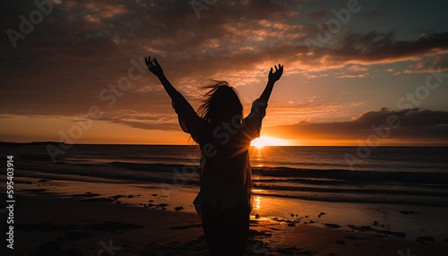 Arms raised in joy, one woman celebrates sunset generated by AI