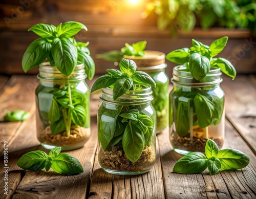 aromatic basil plants in vintage mason jars on a rustic wooden table