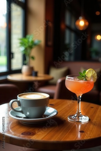 Aromatic Coffee and Refreshing Citrus Cocktail on Wooden Table in Cozy Cafe Setting