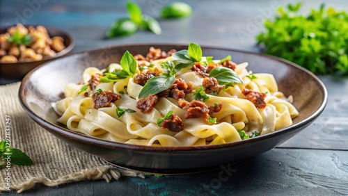 Aromatic Creamy Pasta with Savory Meat Crumbles and Fresh Herbs in a Rustic Bowl
