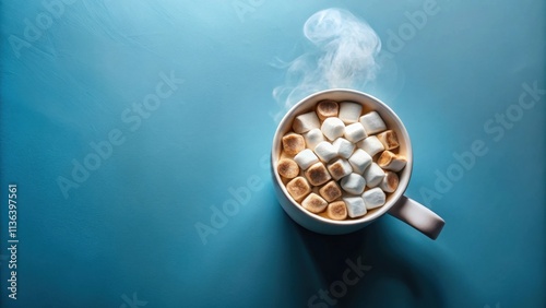 Aromatic Hot Beverage with Toasted Marshmallows in a Mug on a Blue Background