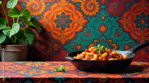 Aromatic Spiced Beans and Pasta in a Rustic Skillet, Served on a Vibrant Tablecloth