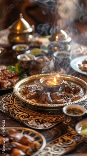 Aromatic Steaming Uzbek Cuisine: Traditional Plov and Delicious Dishes Served in Elegant Brassware