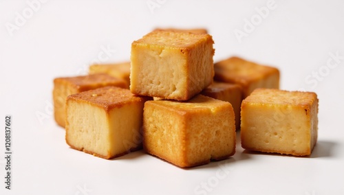 Arranged crispy fried tofu cubes on a clean white backdrop present a tasty protein-packed vegetarianvegan snack