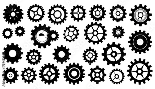 Array of various sized black mechanical gear illustrations on white